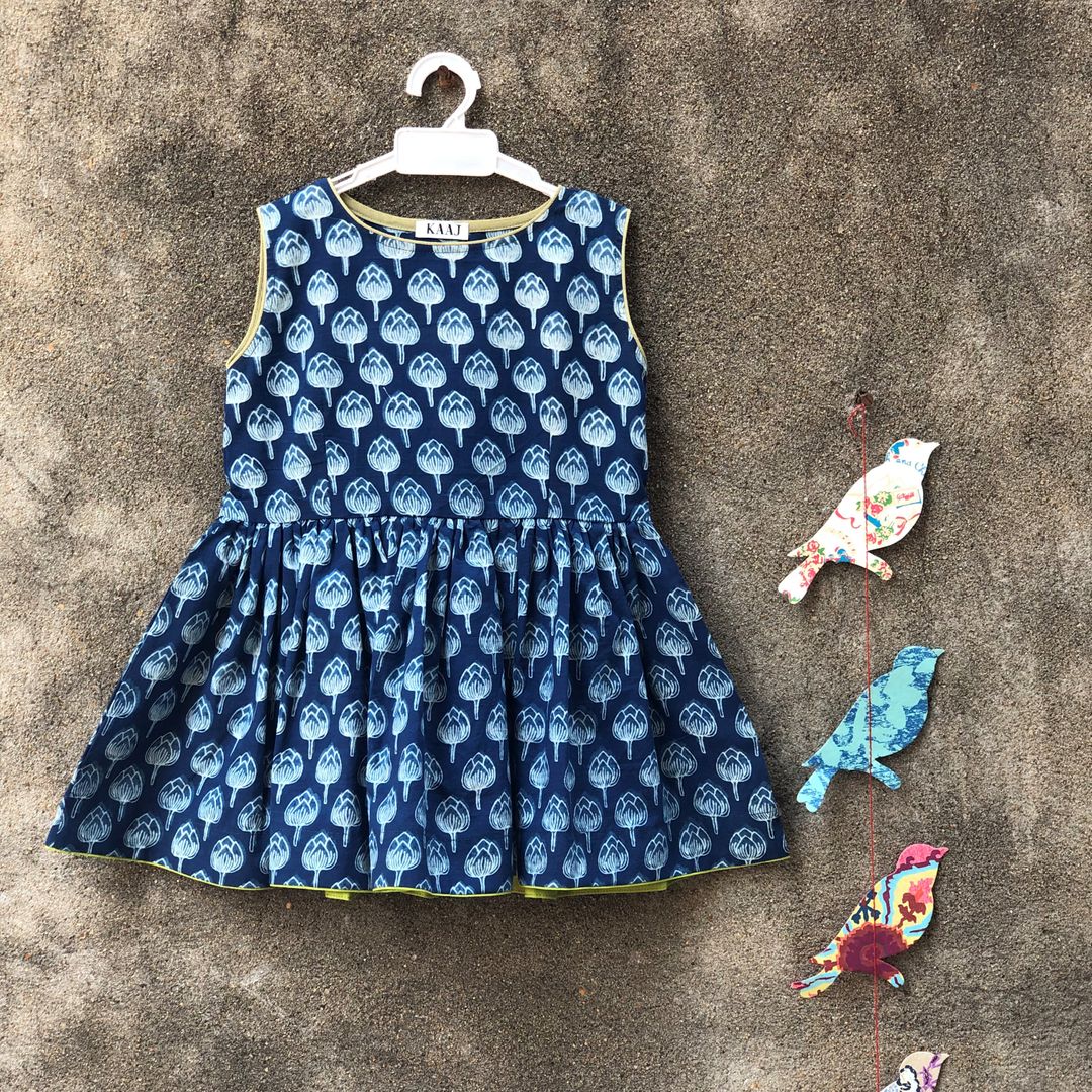 A beautiful indigo hand printed frock for your little one for the summers. It has a fun lotus print and lime green detailing on the neck and sleeves. Made in cotton, it is a comfortable and cute ensemble for you little one!